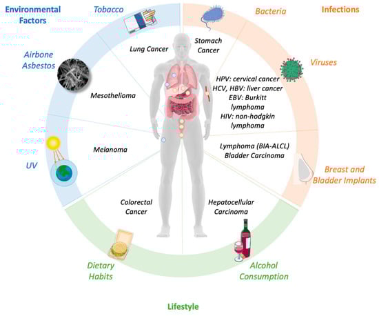 Around 15% of worldwide cancers arise as a direct consequence of infections [,]. Some infections are able to directly induce oncogenic events, such as Epstein–Barr virus (EBV) and human Papillomavirus (HPV): it has been shown that they are able to transform cells by inserting active oncogenes into the host genome. Although their presence is a necessary condition to induce tumor formation, it is not sufficient, and immune suppression is needed for tumor promotion [,,]. The induction of infection-related tumor onset can also be enhanced by the following mechanisms: (i) viral genes are recognized by host cells and they induce the DNA damage response (DDR), increasing the genetic instability; (ii) viruses are able to promote chronic inflammation by generating reactive oxygen and nitrogen species, normally used by leukocytes to fight infection []; (iii) some infections are responsible for immune depression in some patients, disrupting normal immunosurveillance [,]. These events lead cells to chronic infection and, as a consequence, to chronic inflammation and cancer promotion.