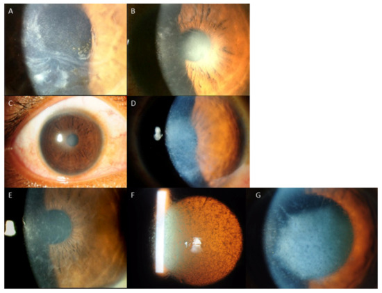 Different phenotypes of LCD1 associated with the same R124C mutation: (A): subepithelial haze and feathery opacities; (B): Thin lattice lines with subepithelial haze; (C): Central subepithelial haze only; (D): Central subepithelial haze with white dots and few lattice lines; (E): Dots and fleck like deposits; (F,G): Lattice lines with multiple grayish white dots and some spiky deposits (GCD2).