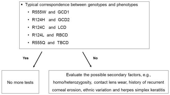 Flowchart for the genotype/phenotype correlation of TGFBI corneal dystrophies. The presence of typical correspondence between genotype and phenotypes can be checked, and if the discrepancy is found, the possible secondary factors, such as, homo/heterozygosity, contact lens wear, history of recurrent corneal erosion, ethnic variation and herpes simplex keratitis, can be evaluated.