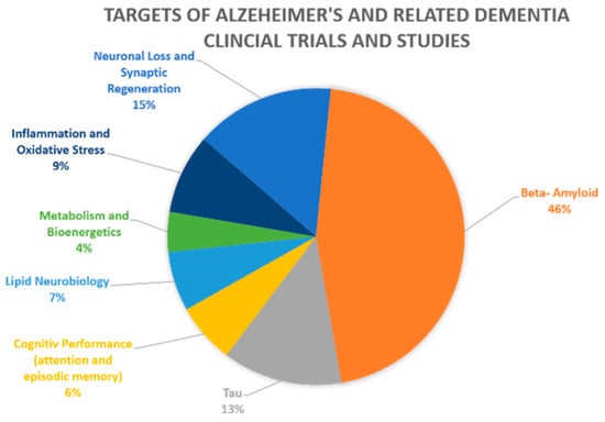 Clinical trials and studies for Alzheimer’s and related dementia by drug targets. The figure represents the 46 current pharmacological NIA-funded active Alzheimer’s and related dementias clinical trials and studies. The different molecular/pathways targets are color coded, with their percentage from all current clinical studies indicated. Beta-amyloid is the target of 46% of the studies, tau and neuronal loss follow far behind with respective percentages of 13% and 15% [7].