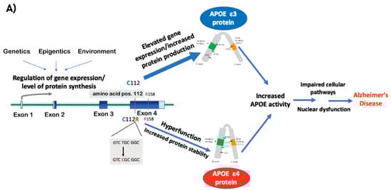 ApoE is encoded by the APOE gene positioned on chromosome 19q13.32 (GRCh 38: chr19:44,905,795–44,909,392). Two common coding SNPs in exon 4 of the gene give rise to three allelic variants, APOE e2, APOE e3, and APOE e4, encoding three corresponding protein isoforms that differ at two amino acid positions, 112 and 158: ApoE2 (Cys112; Cys158), ApoE3 (Cys112; Arg158), and ApoE4 (Arg112; Arg158). It was suggested that the single amino acid change (position 112) between the ApoE3 to ApoE4 protein isoforms resulted in structural differences that involve the interactions between sequences from both the N- and C-terminal domains [13,14] (Figure 2A).
