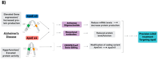 Based on the evidence presented above, we postulate that the e4 allele’s inherent hyperfunction, by which it exerts its pathogenic effect, is comparable to the plausible pathogenic effect of elevated e3 expression. Thus, increased activity of ApoE, mediated by either a coding mutation in exon 4 and/or gene dysregulation, is the key role of APOE in the genetic etiology of LOAD (Figure 2A). Thus, methods for modifying the e4 isoform and/or reducing APOE levels introduce a new promising avenue towards precision medicine in LOAD (Figure 2B).