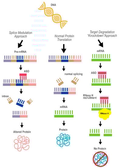 A diagram of the concept behind antisense oligonucleotide (ASO) technology as a therapeutic approach. The two mechanisms underlying the ASO effects, splice modulation and target degradation (“knockdown”), are depicted. The ASO is marked in red. Purple, dark blue and pink represent different exons of the pre-mRNA; brown represents introns; green represent the processed mRNA (the product of correct splicing)
