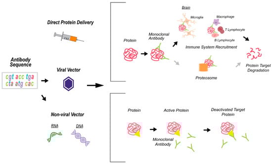 Monoclonal antibody (mAb) therapies designed to target certain cells (e.g., cancer cells) or proteins. The mAbs were developed to target specific protein epitopes and resulted in the deactivation of the protein-of-interest via blocking the protein function (e.g., occupying the ligand-receptor binding site) and/or recruiting the immune system, which, in turn, activates protein degradation pathways, leading to decreased levels of the targeted protein or proteins complex (Figure 4). Most mAb therapy applications utilize direct protein delivery [74]. However, mAbs can be paired with virus-mediated gene transfer, e.g., using adeno-associated (AAV) or lentiviral (LV) vectors or a non-viral delivery route by RNA or DNA expression plasmids [75]. In the case of non-direct delivery (viruses, plasmids), antibody sequences will be inserted and administered to the host cell, and antibody production will occur [76] (Figure 4). Antibody therapy has several strengths, including a well-established protocol-of-delivery and route of administration, ability to cross the blood–brain barrier (BBB), interacts with the immune system, has a long half-life, and their ability to target precise locations, which ultimately makes the viral vectors an efficient delivery vehicle [77,78]. However, there are several shortcomings that characterize antibody-based therapies, including a high-level of immune response, low specificity, low stability and solubility [79], and usually requires repetitive injections in order to achieve therapeutic/correction levels [80].