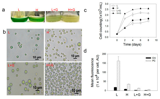 Images of G. sulphuraria liquid cultures (a), microscopic cell images (b), cellular growth curves (c), and bar plot of the mean fluorescence intensities of chlorophyll (Chl) and phycobilin (PC) photosynthetic pigments (d), under low-light intensity (L), low-light intensity with glucose addition (L + G), high-light intensity (H), high-light intensity with glucose addition (H + G). Error bars indicate the standard deviation (n = 6).