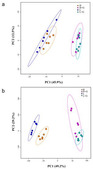 Principal component analysis (PCA) score plots of intracellular metabolomic profiles of G. sulphuraria under low-light intensity (L), low-light intensity with glucose addition (L + G), high-light intensity (H), high-light intensity with glucose addition (H + G) culture conditions. Metabolomics data were collected by (a) GC–MS and (b) LC–MS.
