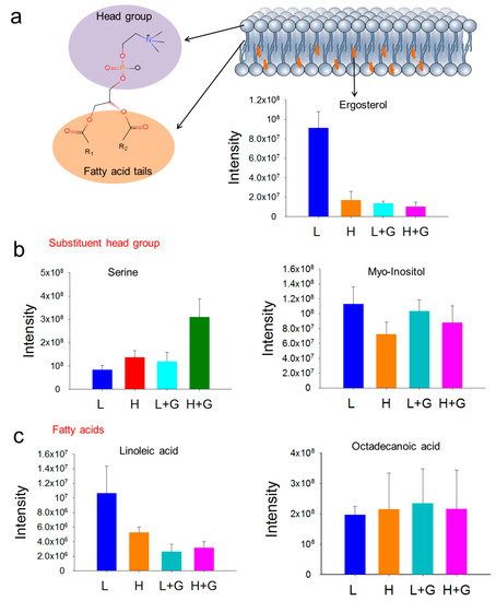 Remodeling of G. sulphuraria membrane lipids. The basic structure of glycerolphospholipids from lipid bilayer membranes and bar plot (GC-MS data) of ergosterol abundances (a); Bar plot of the abundances of various head group metabolites (b) and bar plots of fatty acids tails abundances (c), under low-light intensity (L), low-light intensity with glucose addition (L + G), high-light intensity (H), high-light intensity with glucose addition (H + G) culture conditions.
