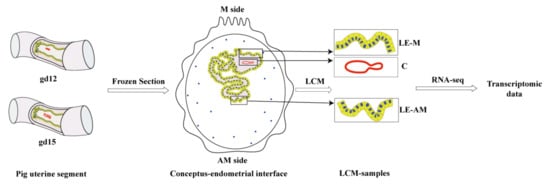 Conceptus must select a particular site within the uterus for initial attachment. In the vertical direction, the uterus is demarcated into two anatomical locations: mesometrial (M) and anti-mesometrial (AM) sides, and initial attachment of pig conceptus normally takes place at the mesometrial side [12,13]. Several genes (such as VEGF, IFN-γ, TNF-α, HIF-1α and ABCA1) were identified to be differentially expressed in endometrium between the two anatomical locations of the uterus during implantation in pigs [14,15]. Our recent study investigated genes and miRNAs expressed in endometrial tissues from the two anatomical locations and detected important genes and pathways that might regulate the mesometrial-biased attachment in pigs [16]. The results indicate that the molecular and physiological signatures in endometrium vary spatially within the uterus. It is worth noting that the conceptus–endometrium interface is complex and consists of heterogeneous cell types/compartments including trophoblast cells, endometrial luminal and glandular epithelial cells, stromal cells, endothelial cells and other cell types. During the attachment, conceptus produces a number of signals which directly act on endometrial epithelium or are transduced by endometrial epithelium to other compartments of the endometrium to induce endometrial receptivity [4,7,8,17]. Recent studies also revealed that genes expressed in endometrial luminal epithelium showed distinct patterns, and endometrial luminal epithelium is the main target of the conceptus signals in pigs [18,19]. Taken together, our hypothesis is that the molecular features between endometrial luminal epithelium adjacent to the conceptus (mesometrial side: M) and luminal epithelium on the opposite side of the conceptus (considered as anti-mesometrial side: AM) may be different and therefore a coordinated communication between conceptus and endometrial luminal epithelium at the two sides is of importance for successful conceptus attachment.