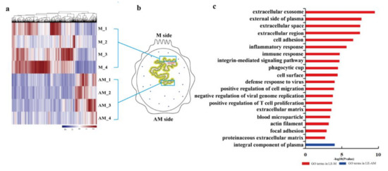 Heatmap and GO analysis for DEGs identified between LE-M and LE-AM on gd12 in pigs. (a) Heatmap for DEGs identified in LE-M compared to LE-AM on gd12. (b) Schematic illustration of the whole pig uterine cross-section taken from gestational day 12. (c) GO analysis of the upregulated DEGs identified in LE-M compared to LE-AM on gd12. DEGs: differentially expressed genes; LE-M: endometrial luminal epithelium at the mesometrial side; LE-AM: endometrial luminal epithelium at the anti-mesometrial side; gd12: gestational day 12 (pre-attachment stage).