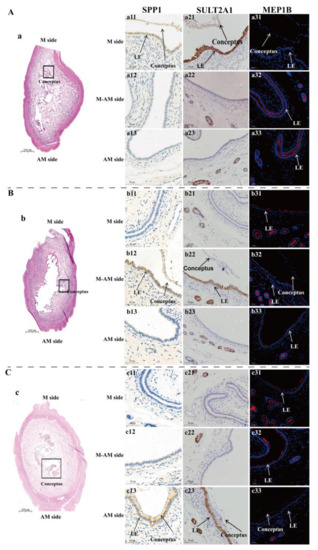 Expression of SPP1, SULT2A1 and MEP1B in the endometrial luminal epithelium in two types of pig uterine samples defined in terms of conceptus localization in the uterus at gestational day 15. (A) Representative images taken from uterine cross-section in which conceptus is located in the mesometrial side (n = 3 gilts). (B,C) Representative images taken from uterine cross-section in which conceptus is located away from the mesometrial side (n = 3 gilts, including uterine cross-sections in which conceptus is located between mesometrial side and anti-mesometrial side and in anti-mesometrial side, respectively.) (a–c) Hematoxylin and eosin-stained whole uterine cross-section. Higher magnification images were taken from the same uterine cross-section and show the localization of the 3 proteins in endometrial regions from the M side ((a11,b11,c11) for SPP1; (a21,b21,c21) for SULT2A1; (a31,b31,c31) for MEP1B), between M and AM side ((a12,b12,c12) for SPP1; (a22,b22,c22) for SULT2A1; (a32,b32,c32) for MEP1B) and AM side ((a13,b13,c13) for SPP1; (a23,b23,c23) for SULT2A1; (a33,b33,c33) for MEP1B) of the uterus, respectively. LE: luminal epithelium; M side: mesometrial side; AM side: anti-mesometrial side. Scale bars = 50 µm.