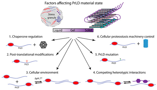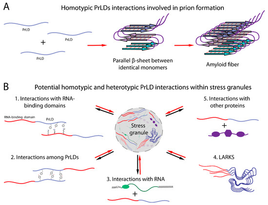 The biomolecular condensation of stress granules is promoted by a network of protein–protein, protein–RNA, and RNA–RNA interactions [120,122]. Many stress granule proteins are multivalent, allowing them to participate in multiple protein–protein and protein–RNA interactions involved in the formation or stabilization of stress granules. Although many protein–protein interactions occur between folded domains, intrinsically disordered regions (IDRs), including PrLDs, provide sites for interaction in many stress granule proteins.