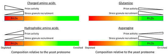 This observation also suggests that it may be a mistake to view PrLDs as a single homogenous class. The term “prion-like domain” is not a functional definition based on actual prion-like activity; it is a descriptive term based on compositional similarity to proteins with prion-like activity. Some PrLDs have clear amyloid or prion-like activity, but many do not [10,151], just as some PrLDs promote recruitment to stress granules [22,26,73], while others inhibit recruitment [27,28]. Furthermore, it is striking that many of the major compositional biases that promote recruitment to yeast stress granules actually make the domains less “prion-like” (Figure 2). While PrLDs are generally enriched in polar amino acids, and depleted in charged and hydrophobic residues, PrLDs that are recruited to stress granules tend to have less extreme versions of each of these biases, although they still have higher polar content and lower charged and hydrophobic content than the average in the yeast proteome [73]. It is unclear how far these trends can be extrapolated. Many IDRs that are outside of the traditional definition of “prion-like” composition are also thought to contribute to the assembly of stress granules and other membraneless organelles, so it is likely that some of the lessons learned from the studies of PrLDs may extend to these other IDRs.