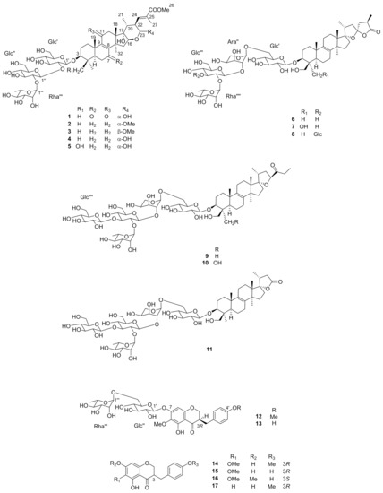 - Ono, M.; Toyohisa, D.; Morishita, T.; Horita, H.; Yasuda, S.; Nishida, Y.; Nohara, T. Three new nortriterpene glycosides and two new triterpene glycosides from the bulbs of Scilla scilloides. Chem. Pharm. Bull. 2011, 59, 1348–1354. [Google Scholar] [CrossRef][Green Version]