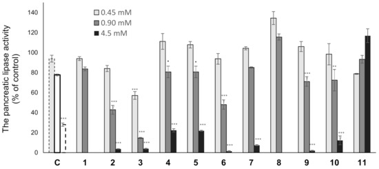 The pancreatic lipase activity of 1–11. Compounds 1 and 8 (0.45 and 0.90 mM), 2–7 and 9–11 (0.45, 0.90, and 4.5 mM), and cetilistat (c) (0.1 [ ], 1.0 [ ], and 10 [ ] μM); Data are represented as the mean ± S.E.M. of three experiments performed in triplicate; *** p < 0.0001 vs. control, ** p < 0.001 vs. control, ˙ p < 0.05 vs. control.