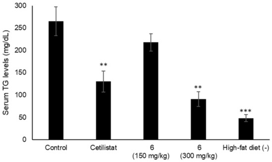 Effects of 6 on the serum TG levels in mice fed a single-dose administration of a high-fat diet. Compound 6 (150 or 300 mg/kg) and cetilistat (180 mg/kg); Data are represented as the mean ± S.E.M. (n = 5); *** p < 0.0001 vs. control, ** p < 0.001 vs. control.