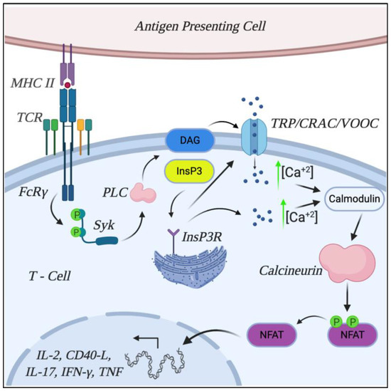T cell receptors (TCR) signaling and the role of calcineurin in systemic lupus erythematosus. After antigen presentation to T0 cells in SLE patients, TCR rewiring occurs, so the ζ chain is replaced by Fc receptor gamma (FcRγ), which binds to the spleen tyrosine kinase (Syk) and induces the phosphorylation of the phospholipase C (PLC). This phosphorylation induces the release of inositol-1,4,5-trisphosphate (InsP3) and diacylglycerol (DAG). The release of DAG in the membrane promotes the activation of membrane channels calcium release-activated channels (CRAC), Transient Receptor Potential (TRP) channels and voltage-gated Ca+2 channels (VOCC), allowing the entry of calcium from the extracellular space. Then, InsP3 migrates to the endoplasmic reticulum, where it binds to the InsP3R receptor and induces an influx of calcium into the intracellular space. The intracellular calcium binds to calmodulin and leads to activation of calcineurin phosphatase. Calcineurin dephosphorylates the nuclear factor of activated T-cell (NFAT) and induces the translocation of this transcription factor to the nucleus, where it promotes the expression of several key genes such as Interleukin (IL)-2, IL-17, tumor necrosis factor (TNF), interferon (IFN)-γ and CD40-L(igand).