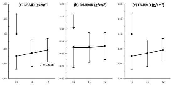 Bone mineral density (BMD) assessed by DXA at (a) lumbar spine (L), (b) femoral neck (FN) and (c) total body (TB) in a sample of 18 women with CAIS (⬤) during HRT (17-β-estradiol 2 mg/daily) (T0 = baseline data, T1 = 1–3 years, T2 = 4–6 years). Control group (◆) consisted of 32 healthy age-matched 46,XX women (drawn from 45).