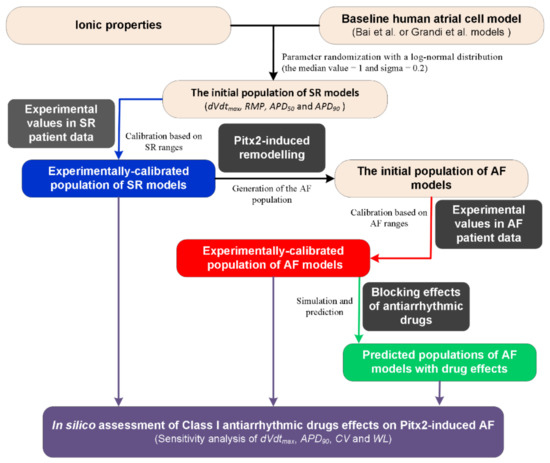 A flow chart illustrating the process for the in silico assessment of class I AADs effects on Pitx2-induced AF is presented in Figure 1. First, the initial population of sinus rhythm (SR) models was created by randomly perturbing parameters associated with ionic properties (Table 1) of the baseline human atrial cell models [41]. The Bai et al. model displaying a type-1 AP with notch-and-dome morphology [27] and the Grandi et al. model displaying a type-3 AP with a typical triangular shape [59] were chosen as the baseline human atrial cell models to represent distinct morphological subtypes of human atrial AP [60]. Parameters associated with ionic properties were allowed to vary independently according to a log-normal distribution and sigma was set to be 0.2 to cover a range of variability similar to that seen in experiments based on previous studies [41,54,61,62]. Second, we used the initial models to simulate human atrial AP by considering stimulation frequency (1 Hz) under the experimental conditions [58] and calculated the AP biomarkers of each initial model. The initial models generated in the previous step were selected to constitute the SR population whose simulated electrophysiological properties are in range with the same properties in experimental data on AP biomarkers (including dVdtmax, RMP, APD50, and APD90) in Table 2. This step yields the experimentally calibrated population of SR models [53]. Third, electrical remodelling due to impaired Pitx2 (Table 3) was introduced into SR model variants to generate the initial population of AF models. Fourth, we used experimental AP biomarkers to calibrate the AF population by excluding the model variants in which values of simulated biomarkers were outside the experimentally observed range (Table 3) reported by Ravens et al [58]. Fifth, the blocking effects of AADs on ion channels (Table 4) were incorporated into experimentally calibrated Pitx2-induced AF models to evaluate their effects on the virtual atrial myocytes. Finally, sensitivity analyses [41,54] of dVdtmax and APD90 at the cellular level and CV and WL at the tissue level were applied to understand modulations by ionic parameters of Pitx2-induced remodelling and ion channels affected by AADs. On the basis of model responses, AADs that eliminated the arrhythmogenic propensity of the atrial substrate arising from Pitx2-induced remodelling were selected.