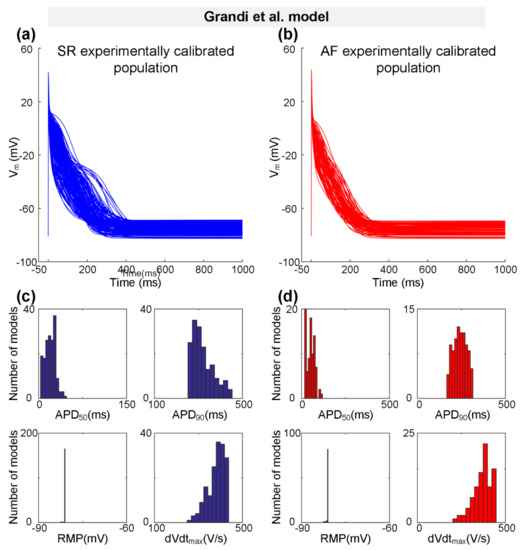 Representing a type-3 AP with a typical triangular shape, the Grandi et al. model [59] was also used to generate the experimentally calibrated populations according to the physiological range of AP biomarkers [58] measured experimentally (Table 2). One hundred and seventy SR models and 87 AF models were selected to constitute the SR population and the AF population, respectively. Figure 3 shows representative AP traces (Figure 3a,b) and distributions of AP biomarkers (Figure 3c,d) for the SR population and the AF population. Consistent with changes in AP biomarkers observed in the Bai et al. model (Figure 2c,d and Table 5), in particular, dVdtmax is increased from 351.14 ± 48.90 V/s for the SR population to 368.66 ± 52.15 V/s for the AF population, whereas APD90 is decreased from 251.08 ± 61.50 ms for the SR population to 241.82 ± 37.98 ms for the AF population (Table 5).