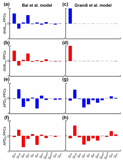 Experimental studies have demonstrated that sensitivity analyses of dVdtmax and APD90 can provide insights into alterations in the depolarisation rate [80,81,82,83] and the repolarisation time [84] of the cardiac tissue. We applied partial correlation analysis to predict alterations in dVdtmax and APD90 when electrical remodelling (listed in Table 3) due to impaired Pitx2 was introduced or ion channels (listed in Table 4) were blocked by class I AADs. Parameters associated with Pitx2-induced electrical remodelling include GNa, GCaL, GKs, GK1, Grel, and Gup, while parameters affected by actions of AADs (including disopyramide, quinidine, and propafenone) include GNa, GCaL, Gto, GKs, GKr, GKur, GKATP, GKAch,Ado, and GK1. We used partial correlation analysis to calculate partial correlation coefficients (PCCs) to quantify correlations between the parameter values and dVdtmax and APD90. In Figure 4a,d, dVdtmax PPCs are positive for GNa in Bai et al. and Grandi et al. populations, suggesting that upregulated INa in Pitx2-induced remodelling would tend to increase the depolarisation rate and inhibit INa due to actions of AADs reducing depolarisation rate. In Figure 4e,h, APD90 PPCs are negative for GKs, GKr, GKAch,Ado, and GK1 but not for GCaL, indicating that upregulated GKs and downregulated GCaL in Pitx2-induced remodelling cause APD shortening and blocking these potassium currents (i.e., IKs, IKr, IKAch, and IK1) would tend to prolong APD. APD90 PPCs for Gto, GKATP, and GKur are also negative in Grandi et al. but not Bai et al. populations. Therefore, in Grandi et al. populations, APD90 PPCs for Gto, GKs, GKr, GKur, GKAch,Ado, GKATP, and GK1 are negative, suggesting that inhibiting these currents due to actions of AADs produces positive APD prolongation. In contrast, in Bai et al. populations, negative APD90 PPCs are seen for IKs, IKr, IKAch, and IK1 only, indicating that the blocking effects of class I drugs on IKs, IKr, IKAch, and IK1 are associated with positive APD prolongation, but the blocking effects of AADs on Gto, GKATP, and GKur with negative APD prolongation.