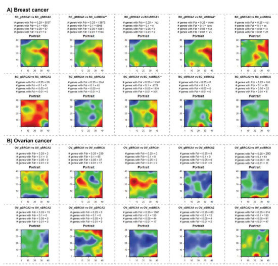 The distribution of up- and down-regulated spot areas in the transcriptome portraits shows considerable variability between studied groups in both diseases. Upregulated genes in mutation carrier vs. non-carrier groups showed mirroring localizations in both diseases, indicating differential, partly antagonistic activation of expression programs. Additionally, common patterns were observed. For example, BRCA1/2 mutations in breast cancer (BC) are uniquely associated with the upregulation of genes located in the right part of the map. For ovarian cancer (OV) one finds a similar result where upregulated genes in mutated samples were found in the lower right part. One also sees that somatic mutations of BRCA1 or BRCA2 associate with additional up-regulated spots compared to their germline counterparts (for example compare gBRCA1 and sBRCA1 portraits for breast cancer, or gBRCA2 vs. sBRCA2 portraits for ovarian cancer). To visualize these differences, we generated “difference portraits” between the groups. The analysis confirmed common gene expression deregulation in BRCA1/2 mutation carrier patients compared to non-carriers both in the breast (Figure 2A) and ovarian cancers (Figure 2B). The strongest deregulation of gene expression is observed for the gBRCA1 group in breast cancer.
