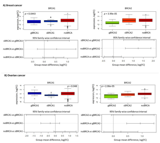 The BRCA1 and BRCA2 genes play an important role in maintaining genomic integrity and tumor suppression through the mediation of DNA repair by homologous recombination and reactivation of replication [1,2]. The prevalence of germline BRCA1 and BRCA2 mutations is 5–15% in breast cancer (BC) [3] and 10–25% of ovarian cancer (OV) patients [4,5,6,7]. Along with the mutation carriers, the cumulative risk is around 70% and 14–44% for breast and ovarian cancers, respectively [8]. The effects of BRCA1 and BRCA2 on survival are also being intensively studied, although with conflicting results. In breast cancers, most of the studies have reported worse clinical prognosis for patients with BRCA1 mutations compared with BRCA2 mutation carriers and non-carriers [9,10,11]. Meanwhile, in other studies, no difference in survival [12], the worse outcome for BRCA2 mutations [13], and favorable outcomes for BRCA1 mutations were found [14]. Similarly, discrepant results were also observed in ovarian cancers. While favorable prognosis was mostly observed for carriers of BRCA1 and BRCA2 mutations [6,15,16], some studies attribute better survival exclusively to BRCA2 [17], and others report no difference [18]. The mechanisms driving the differential association between BRCA1 and BRCA2 mutations with progression and survival in breast and ovarian cancers are not completely understood. On a molecular level, few studies were aimed at addressing this issue. The study by Jazaeri et al. (2002) has shown that there are considerable differences in transcriptome profiles in ovarian cancer patients bearing mutations in BRCA1 or BRCA2, which suggests activation of different mechanisms of the disease [19]. In much the same way, few studies found differences in gene expression profiles in BRCA1-linked breast cancer patients compared with non-carriers [20,21]. At the same time, little is known about transcriptome associated molecular effects of somatic and germline mutations in either of the BRCA genes. In this study, we aimed at systemic evaluation of the relationships between BRCA1 and BRCA2 germline and somatic mutations, associated gene expression, disease clinical features, outcome, and treatment.