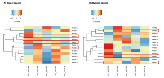 In addition to BRCA1 and BRCA2, we were also interested in evaluating the expression of poly(ADP-ribose) polymerase (PARP) genes, representing another key gene family in BC and OV pathophysiology and treatment [38,39,40]. PARP family genes have enzymatic and scaffolding activities and are implicated in DNA repair properties [41]. So, we performed a cluster analysis using expression values of 13 PARP genes available in our datasets (Figure 4). Of three PARP genes (PARP1–3) implicated in DNA repair [38], the highest expression of PARP1 was observed in germline BRCA1 carriers in both breast and ovarian cancers. Moreover, in any group, the expression of at least one PARP1–3 gene was increased. Expression of other PARP genes was higher in somatic BRCA1 and BRCA2 carriers in breast cancer, and in gBRCA1, sBRCA1, and gBRCA2 in ovarian cancers.