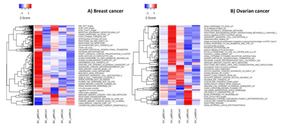 The following are available online at https://www.mdpi.com/1422-0067/22/3/1266/s1, Supplementary Data 1: Pairwise differential expression of genes across groups in breast cancer, Supplementary Data 2: Pairwise differential expression of genes across groups in ovarian cancer, Figure S1: Clustering of deregulated BRCA1- and BRCA2-associated GO Biological Process functional categories in the breast (A) and ovarian (B) cancers, Figure S2: Clustering of deregulated BRCA1- and BRCA2-associated GO Molecular Function functional categories in the breast (A) and ovarian (B) cancers, Figure S3: Clustering of deregulated BRCA1- and BRCA2-associated transcription factor targets in the breast (A) and ovarian (B) cancers, Figure S4: Clustering of deregulated BRCA1- and BRCA2-associated “cancer hallmarks” in the breast (A) and ovarian (B) cancers, Figure S5: Clustering of deregulated BRCA1- and BRCA2-associated GSEA C2 functional categories in the breast (A) and ovarian (B) cancers, Figure S6: Drug transcriptome map relations for breast(A) and ovarian(B) cancers.