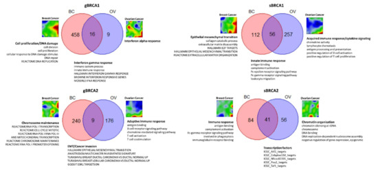 Overlap of functional gene sets upregulated in mutation associated group transcriptome landscapes in breast (BC) and ovarian (OV) cancers.