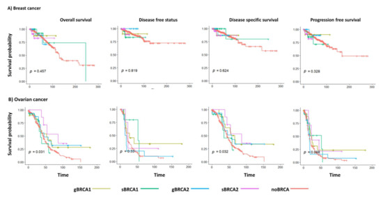 We have also analyzed the survival data of BC and OV associated with BRCA mutations. In breast cancer, no differences were observed in overall, disease-free, disease-specific, and progression-free survival in studied groups (Figure 9A). In contrast, overall survival, as well as disease-specific survival in OV, were slightly better in gBRCA1 and sBRCA2 groups, respectively (Figure 9B).
