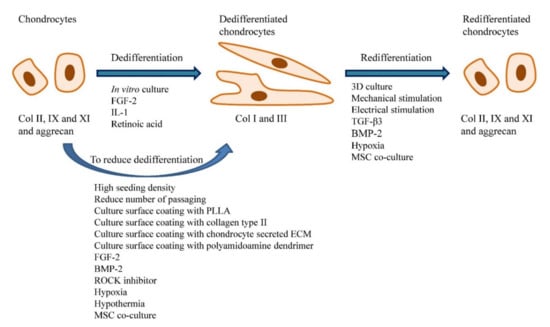 The dedifferentiation of chondrocytes in culture can be slowed down by seeding cells at high density, reducing number of cell passage, culturing the cells in hypoxic and hypothermic environment, expanding the cells on specific substrates (e.g., col II, poly(L-lactic acid), polyamidoamine dendrimer), addition of certain chemicals (e.g., insulin-transferrin-selenium, FGF-2, ROCK inhibitor), and co-culturing with mesenchymal stem cells (MSCs) [44,45,46,47,48,49,50,51,52]. Coating of culture surface with collagen type I (col I) and aggrecan showed limited success as they were found to reverse the changes in col I and aggrecan gene expression but failed to reverse the downregulation of col II gene expression [53]. Interestingly, FGF-2 that has been reported to enhance chondrocyte dedifferentiation was also found to slow down the dedifferentiation process [27,47]. Table 3 shows the list of strategies that can be applied to slow down dedifferentiation of chondrocytes in monolayer culture. Figure 2 shows the factors that modulate the chondrocyte dedifferentiation and redifferentiation in vitro.