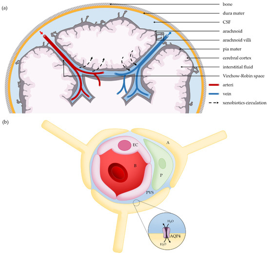 Anatomical structures of brain vasculature. (a) The glymphatic system: xenobiotics circulation, diffusion and efflux along perivascular spaces after intrathecal administration. (b) Cross section of a brain vessel: xenobiotics circulate along perivascular spaces of blood vessels. A: astrocyte, regulator of the hydrostatic pressure by water exchanges; AQP4: aquaporin 4; P: pericyte; EC: endothelial cell; PVS: perivascular space; B: blood. (Images modified from © SMART/CC-BY-3.0).