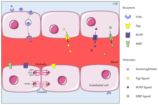 As the BBB restricts large hydrophilic molecules from entering the brain parenchyma, direct injection of xenobiotics into the cerebrospinal fluid is a promising method to bypass the lack of permeability of the blood–brain barrier [30,31]. However, this approach has limitations, since drug transporters are responsible for an active efflux of xenobiotics from brain to blood. These transporters, mainly ATP-binding cassette (ABC) transporters and neonatal Fc receptor (FcRn), are expressed by endothelial cells in the BBB. This efflux, by preventing drugs from reaching relevant concentrations in the brain parenchyma, could explain their limited efficacy after intravenous administration and also after intracerebrospinal fluid administration [32,33,34,35,36,37].