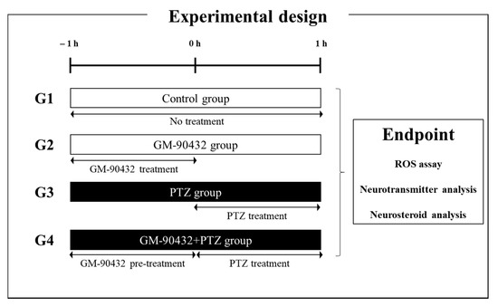 Experimental scheme used to determine the protective effect of GM-90432 against PTZ-induced epileptic seizures in zebrafish larvae and adults. Zebrafish were separated into 4 different treatment groups (G): G1: control group, G2: GM–90432 group, G3: PTZ-induced epilepsy model group, and G4: GM-90432 + PTZ group. At the experimental endpoint, zebrafish were sacrificed for analysis of ROS levels (larva only), and neurotransmitter and neurosteroid analyses.