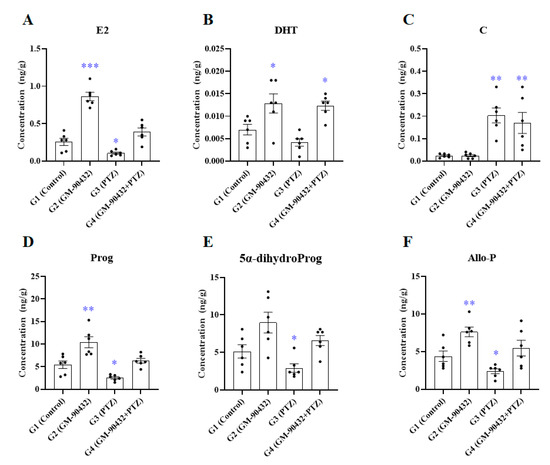The levels of E2 (A), DHT (B), C (C), Prog (D), 5α-dihydroProg (E), and Allo-P (F) in brain samples of zebrafish exposed to GM-90432, PTZ, or PTZ following pretreatment with GM-90432. Values represent means ± SEM of 6 samples. The brain samples from 2 individual zebrafish were pooled to form composite samples. Significance between control and exposure groups is indicated by * p < 0.05, ** p < 0.01, and *** p < 0.001.