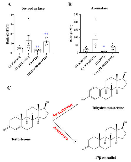 The enzymatic activity by altered metabolic ratio in brain samples of zebrafish. (A) Altered metabolic ratio (5α-reductase) of T to DHT in brain samples of zebrafish exposed to GM-90432, PTZ, or PTZ following pretreatment with GM-90432. (B) Altered metabolic ratio (aromatase) of T to E2 in brain samples of zebrafish exposed to GM-90432, PTZ, or PTZ following pretreatment with GM-90432. (C) The metabolic pathway of T conversion to DHT or E2. Values represent means ± SEM of 6 samples. Brain samples from 2 individual zebrafish were pooled to form composite samples. Significance between control and exposure groups is indicated by * p < 0.05 or ** p < 0.01.
