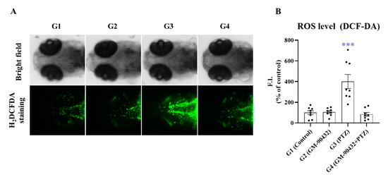 Protective effect of GM-90432 in PTZ-induced ROS generation. (A) The intracellular ROS were stained with DCF-DA dye for 20 min. Fluorescence images of ROS generation in zebrafish larvae in the 4 experimental groups. (B) The relative fluorescence intensities of ROS levels in individual larvae were quantified. Values represent means ± SEM of 10 samples. Significance between control and exposure groups is indicated by *** p < 0.001.