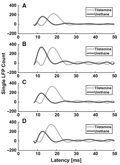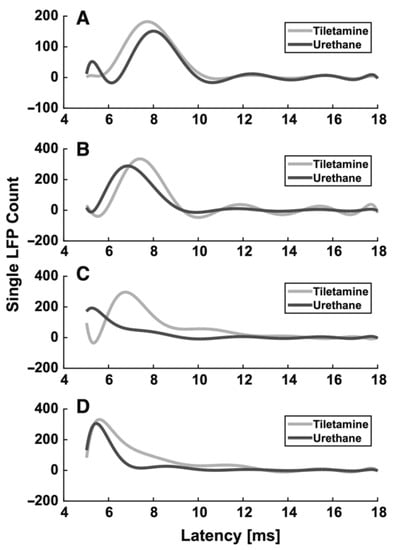 From the previous paragraphs it clearly emerges that the use of different anesthetics during in vivo electrophysiological recordings affects sensory-evoked LFPs. As an example, we summarize the different effects of two different anesthetics (tiletamine—which is a ketamine analog—combined with xylazine, and urethane) on whisker-evoked responses in the rat barrel cortex [,]. At each cortical depth in layers II, III, IV and Va, 500 single-trial responses were recorded through standard Ag/AgCl electrodes upon the principal whisker mechanical deflection. The effect of anesthesia on the sensory information processing was assessed by comparing the main features (i.e., latency of the response onset, latency of the principal peak and amplitude of the principal peak) of the evoked single LFPs recorded from different rats, anesthetized with either tiletamine-xylazine (n = 5) or urethane (n = 4). Histograms were made from the extracted main parameters of the LFP traces. To better illustrate the trends in each anesthetic, estimations of the histograms were calculated by fitting higher order polynomials (Figure 1 and Figure 2). Interestingly, we found that the onset and the peak latency of signals recorded under the two anesthetics followed two different distributions, accompanied by a layer-dependent behavior. Under tiletamine-xylazine, the evoked responses recorded from the superficial layers II and III showed less variability than those recorded from the deeper layers IV and Va. This was highlighted in the distributions of the onset (Figure 1, in gray) and peak (Figure 2, in gray) latencies: in particular, the distribution of the onset latencies was wider in the deeper layers than in the superficial ones. This trend was instead reversed in the evoked LFPs responses recorded under urethane: the distributions of the onset (Figure 1, in black) and peak (Figure 2, in black) latencies were slightly narrower in the deeper layers than in the superficial ones. By comparing the distributions obtained from the two different anesthetics, it seemed that the onset latency distributions were narrower in the case of urethane and that the peak of the evoked LFPs occurred earlier than the one recorded under tiletamine-xylazine anesthesia. In summary, evoked responses seemed to be deeply influenced by the type of anesthetic used, as urethane appeared to promote more precise, stronger and faster responses than those generated under tiletamine-xylazine.
