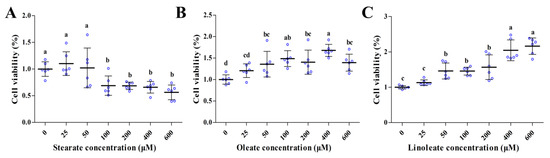 Effect of stearate, oleate and linoleate on cell viability in pMECs. pMEC cells were incubated with 0 (control), 25, 50, 100, 200, 400 and 600 μM stearate (A), oleate (B) or linoleate (C), respectively, for 24 h. Cell viability was estimated by MTT test. Values, expressed as percentage of control, are presented as mean ± SD (n = 6, blue dots display the number of measurements). Comparisons between groups were performed via ANOVA and Tukey’s range test for multiple comparisons. Different letters indicate statistical significance between different concentrations of stearate, oleate and linoleate treatment groups (p < 0.05).