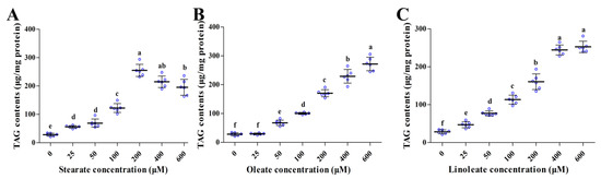 Effect of stearate, oleate and linoleate on cellular TAG content in pMECs. pMEC cells were incubated with 0 (control), 25, 50, 100, 200, 400 and 600 μM stearate (A), oleate (B) or linoleate (C), respectively, for 24 h. The data are expressed as the mean ± SD (n = 6, blue dots display the number of measurements). Comparisons between groups were performed via ANOVA and Tukey’s range test for multiple comparisons. Different letters indicate statistical significance between different concentrations of stearate, oleate and linoleate treatment groups (p < 0.05).