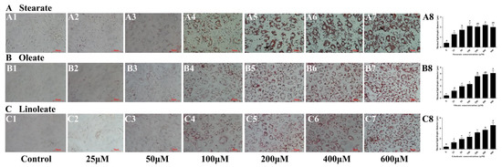 Effect of stearate, oleate and linoleate on lipid droplet formation in pMECs. Cells were incubated with 0 (control), 25, 50, 100, 200, 400 and 600 μM stearate (A), oleate (B) or linoleate (C), respectively, for 24 h, and then stained with oil red O and visualized by light microscopy with 400 × magnification. (A1), 0 μM stearate (Control); (A2), 25 μM stearate; (A3), 50 μM stearate; (A4), 100 μM stearate; (A5), 200 μM stearate; (A6), 400 μM stearate; (A7), 600 μM stearate; (A8), maximal lipid droplet diameter in the cells with 0 (control), 25, 50, 100, 200, 400 and 600 μM stearate; (B1), 0 μM oleate (Control); (B2), 25 μM oleate; (B3), 50 μM oleate; (B4), 100 μM oleate; (B5), 200 μM oleate; (B6), 400 μM oleate; (B7), 600 μM oleate; (B8), maximal lipid droplet diameter in the cells with 0 (control), 25, 50, 100, 200, 400 and 600 μM oleate; (C1), 0 μM linoleate (Control); (C2), 25 μM linoleate; (C3), 50 μM linoleate; (C4), 100 μM linoleate; (C5), 200 μM linoleate; (C6), 400 μM linoleate; (C7), 600 μM linoleate; (C8), maximal lipid droplet diameter in the cells with 0 (control), 25, 50, 100, 200, 400 and 600 μM linoleate. In A8, B8 and C8, data are expressed as mean ± SD (n = 5), and comparisons between groups were performed via ANOVA and Tukey’s range test for multiple comparisons. Different letters indicate statistical significance between different concentrations of stearate, oleate and linoleate treatment groups (p < 0.05).