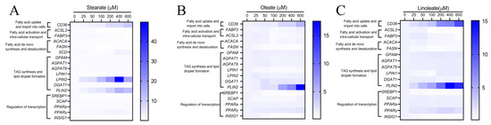 Representation of qPCR experimental data on mRNA expression of genes involved in lipid synthesis in pMECs. pMEC cells were incubated with 0 (control), 25, 50, 100, 200, 400 and 600 μM stearate (A), oleate (B) and linoleate (C), respectively, for 24 h. (A) Heatmap showing the expression levels of genes in response to graded-stearate concentration. (B) Heatmap showing the expression levels of genes in response to graded-oleate concentration. (C) Heatmap showing the expression levels of genes in response to graded-linoleate concentration.