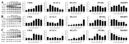Incubation with the three 18-carbon fatty acids (stearate, oleate or linoleate) for 24 h enhanced the mRNA expression of genes associated with TAG synthesis (GPAM, AGPAT6, LPIN2, DGAT1) and lipid droplet formation (PLIN2). The cellular mRNA expressions of GPAM, AGPAT6, LPIN2, DGAT1 and PLIN2 were increased linearly or quadratically with increasing stearate (p < 0.05, Table 1, Table 2 and Table 3). Consistent with its gene mRNA expression, DGAT1 protein expression in pMECs was significantly up-regulated by 50–600 μM stearate, with the highest values observed at 400 μM stearate (p < 0.05, Figure 5A). Similarly, the cellular mRNA expressions of GPAM, AGPAT6, LPIN1 or 2, DGAT1 and PLIN2 were increased linearly or quadratically with increasing oleate or linoleate, respectively (p < 0.05, Table 2 and Table 3). PLIN2 expression was significantly increased by oleate or linoleate, and its expression increased 16.5-fold and 14.1-fold to peak values at 600 μM oleate and 400 μM linoleate, respectively. DGAT1 protein expression was significantly increased 8.0-fold and 7.4-fold (p < 0.05) with 600 μM oleate and linoleate, respectively, compared to the control.