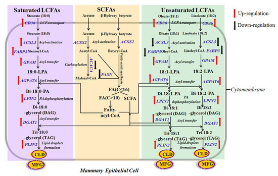 - Lv, Y.; Zhang, S.; Guan, W.; Chen, F.; Zhang, Y.; Chen, J.; Liu, Y. Metabolic transition of milk triacylglycerol synthesis in response to varying levels of palmitate in porcine mammary epithelial cells. Genes Nutr. 2018, 13, 18. [Google Scholar] [CrossRef] [PubMed]