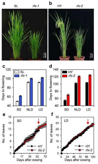 The rfs-1 and rfs-2 mutants used in this study were reported previously [32]. Rice plants were grown in the paddy field under NLD conditions (≥14 h sunlight/day, 37° N latitude) in Suwon, Republic of Korea. To perform experiments under controlled day-length conditions, rice plants were grown in growth chambers under LD (14.5-h light and 9.5-h dark) or SD (10-h light and 14-h dark) conditions at 30 °C in the light and 24 °C in the dark.