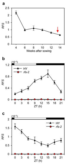 The RFS transcript levels were measured every 2 weeks from 4 to 14 weeks after sowing (WAS) at zeitgeber time (ZT) 1 by RT-qPCR analysis. RFS was constitutively expressed during plant growth, implying that RFS has roles throughout plant development (Figure 2a). We also analyzed the diurnal expression of RFS under SD and LD conditions. The leaf blades of HY and rfs-2 plants were harvested every 3 h during a 24-h period at 25 DAS under SD conditions and at 80 DAS under LD conditions; these timepoints were approximately 30 days before flowering in HY. RFS transcripts were not detectable in rfs-2 leaf blades, but in HY, RFS showed diurnal expression patterns with a peak at night under SD conditions and at dawn under LD conditions (Figure 2b,c).