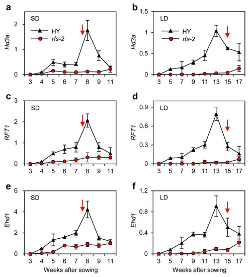 We monitored the transcript levels of two rice florigen genes (Hd3a and RFT1) in developing leaves of HY and rfs-2 plants harvested at ZT1 throughout the vegetative stages, until the HY plants flowered. Hd3a and RFT1 transcripts gradually increased in HY with a peak at 8 WAS under SD and 15 WAS under LD conditions to trigger the transition to reproductive growth (Figure 3a–d) [34,35]. However, the expression of Hd3a and RFT1 remained low in the rfs-2 mutant throughout the experiment. The expression of Ehd1 was similar to that of the florigen genes in HY and rfs-2 plants (Figure 3e,f). These results suggest that mutation of RFS downregulates the expression of flowering genes, leading to late flowering in rice.