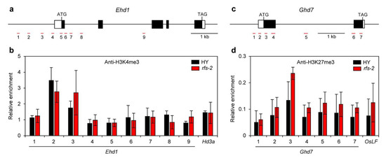 To test these hypotheses, we examined the enrichment of modified histone proteins on Ehd1 and Ghd7 chromatin using specific antibodies against H3K4me3 and H3K27me3. We used Hd3a and OsLF as positive controls for methylated histone-enriched loci. SDG701 deposits H3K4me3 on the Hd3a locus to activate Hd3a transcription [13]. The PRC2 complex targets the OsLF locus and deposits H3K27me3 to repress OsLF transcription [20,22]. We found that while H3K4me3 was highly enriched in the promoter region of Ehd1 compared to the intergenic region, the H3K4me3 level in Ehd1 did not differ between HY and the rfs-2 mutant (Figure 5a,b). H3K27me3 in Ghd7 was higher around the transcription start site than in the intergenic region. However, there was no significant difference in enrichment of H3K27me3 at the Ghd7 locus between HY and the rfs-2 mutant (Figure 5c,d).