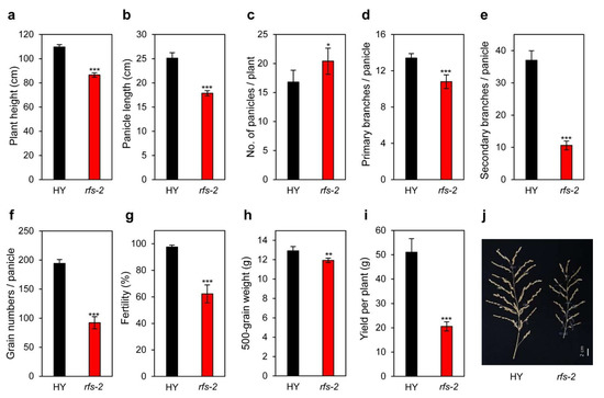 To identify whether the rfs mutation affects grain yield and yield components, we evaluated agronomic traits, including plant height, number of panicles per plant, length of panicles, number of panicle branches per panicle, number of grains per panicle, spikelet fertility, 500-grain weight, and yield per plant, in HY and rfs-2 plants grown in the paddy field under NLD conditions [38]. Plant height and panicle length of the rfs-2 mutant were shorter than those of HY (Figure 6a,b). The rfs-2 mutant had more panicles per plant compared to HY, but had fewer primary and secondary branches per panicle (Figure 6c–e,j). In addition, the number of grains per panicle, spikelet fertility, and 500-grain weight were significantly lower in the rfs-2 mutant compared to HY (Figure 6f–h). The reduction of spikelet fertility in the rfs-2 mutant might be due to delayed flowering, which results in later grain filling, when conditions tend to be unfavorable due to lower temperatures. Consequently, total grain yield was lower in the rfs-2 mutant due to the reduction of yield components, including spikelet fertility, grain number, and 500-grain weight, although the mutant plants had more panicles per plant compared with HY (Figure 6i).