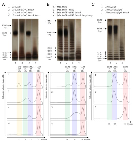 | wzzB | Chromosomal encoded OAg co-polymerase, responsible for MMM OAg polymerization in S. sonnei, S. flexneri and S. Typhimurium | Lack of MMM OAg formation in S. sonnei and S. Typhimurium; De-regulation of OAg polymerization in S. flenxeri 2a |
